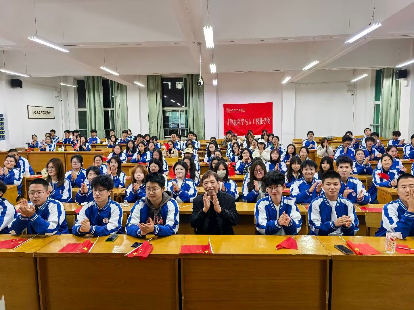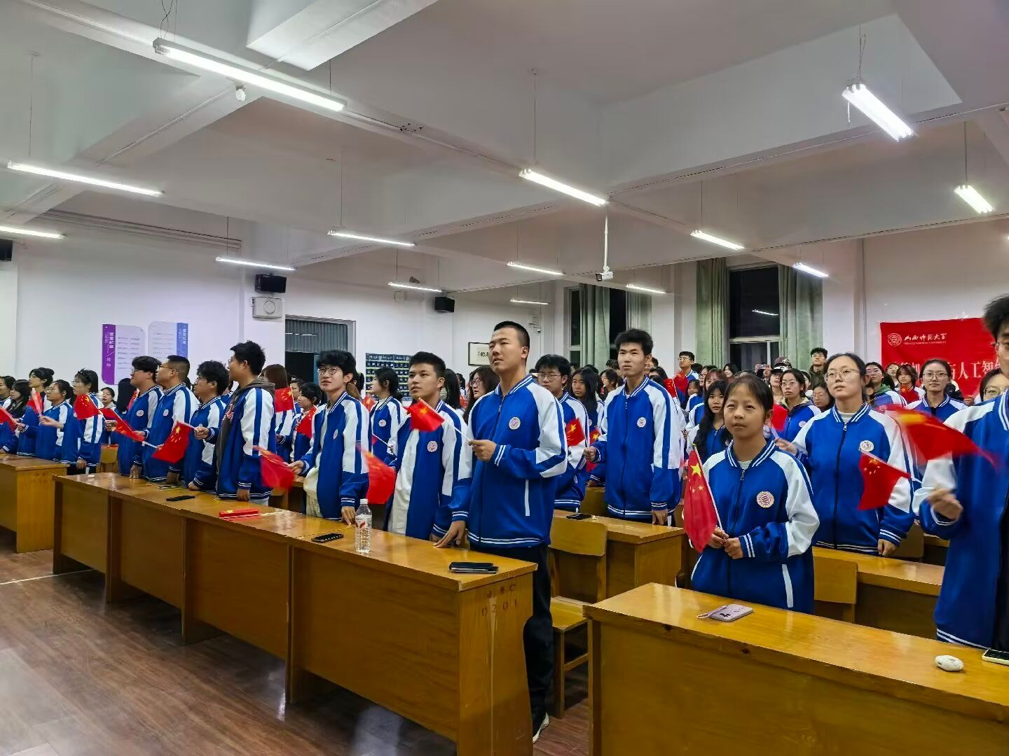 讲座尾声,全体同学齐声高唱《我爱你中国》,深情激昂的旋律将现场气氛推向高潮。