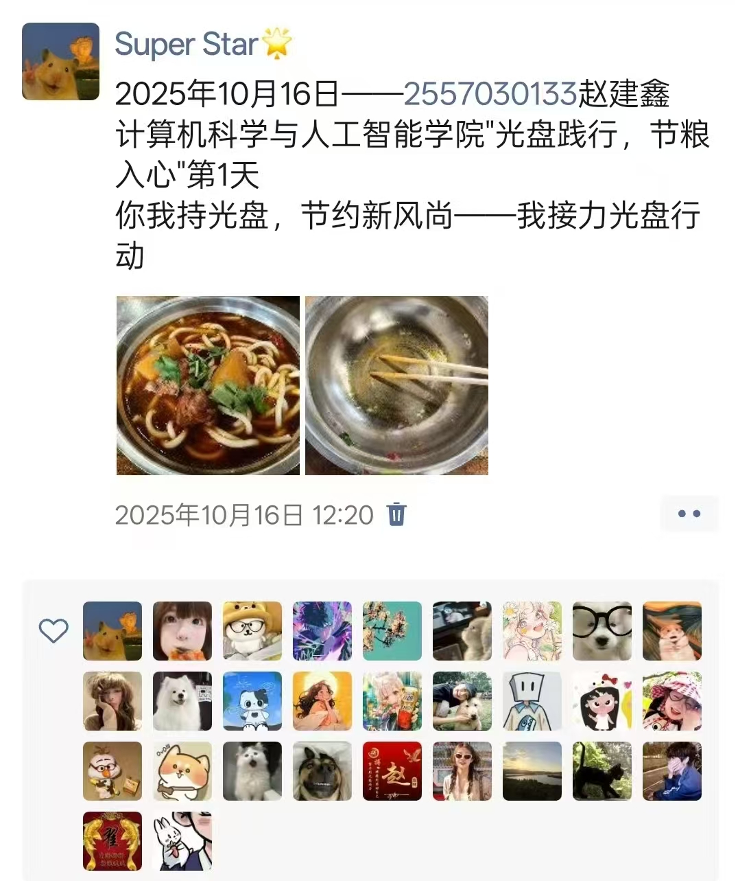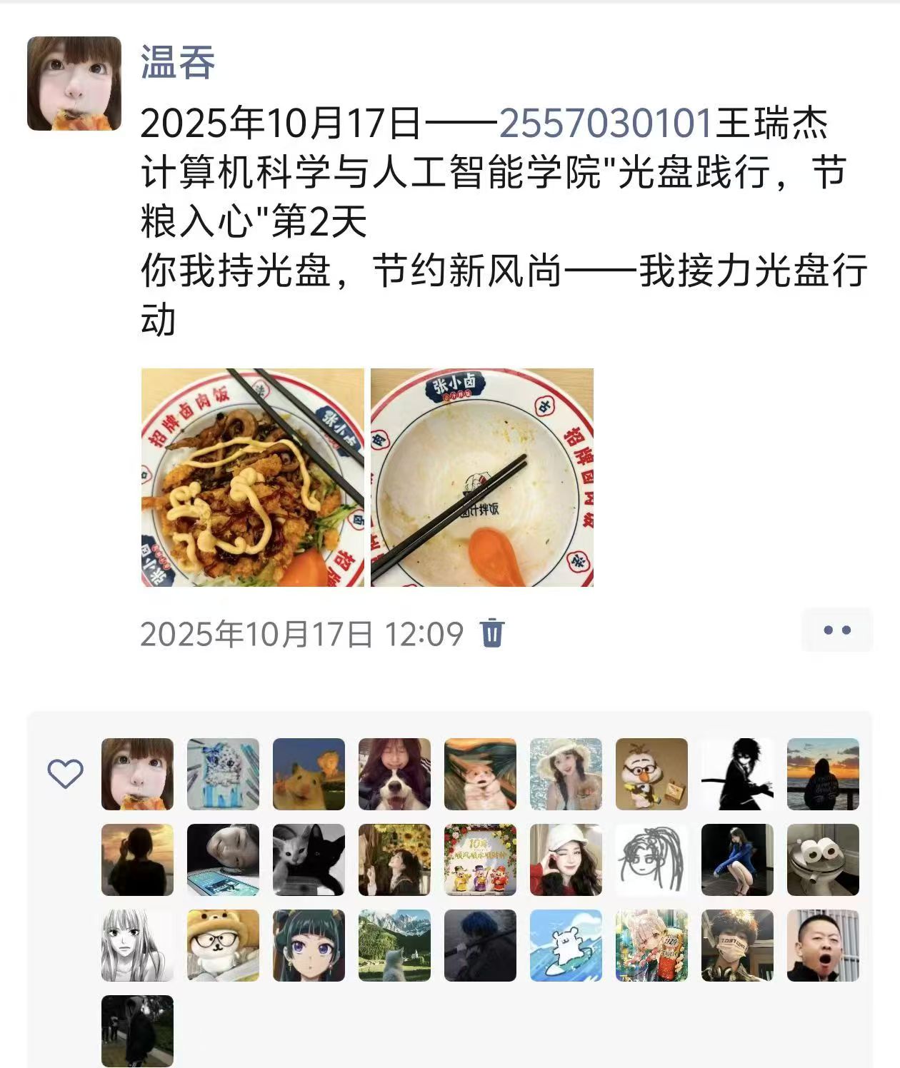 活动期间,同学们每日在朋友圈按规定格式分享“光盘”照片,主动践行“光盘行动”,传递“拒绝舌尖上的浪费”的绿色理念。大家在参与中深刻体会到“一粒米,一滴汗,粒粒粮食汗珠换”的来之不易,让“粮食节约,人人有责”的意识植根心中。