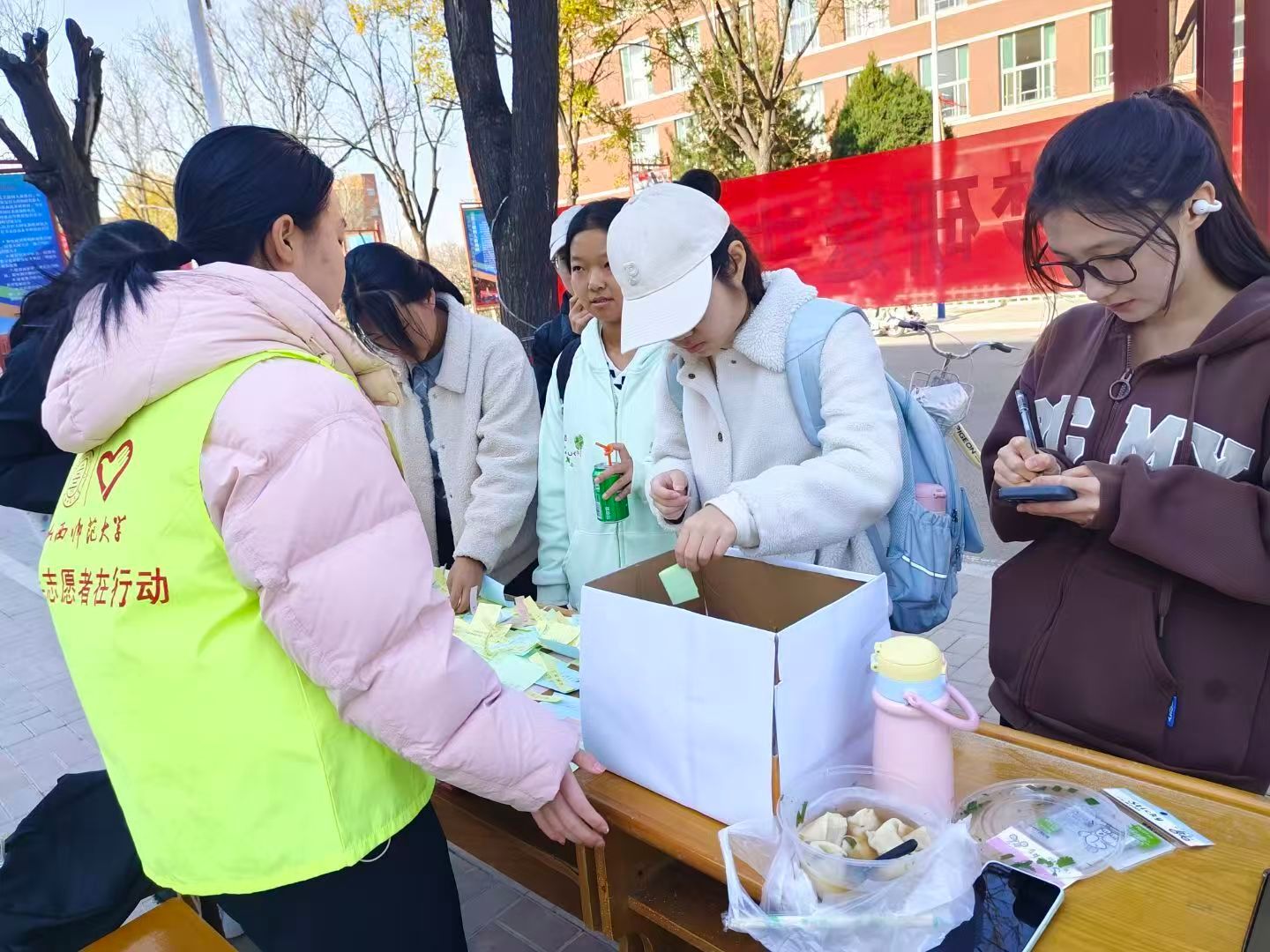 11月13日,我院青年志愿者协会在南区六号教学楼前举办“提笔寄意,暖心同行”活动,吸引了众多同学积极参与,在纸笔交织间营造出温馨友爱的校园氛围。