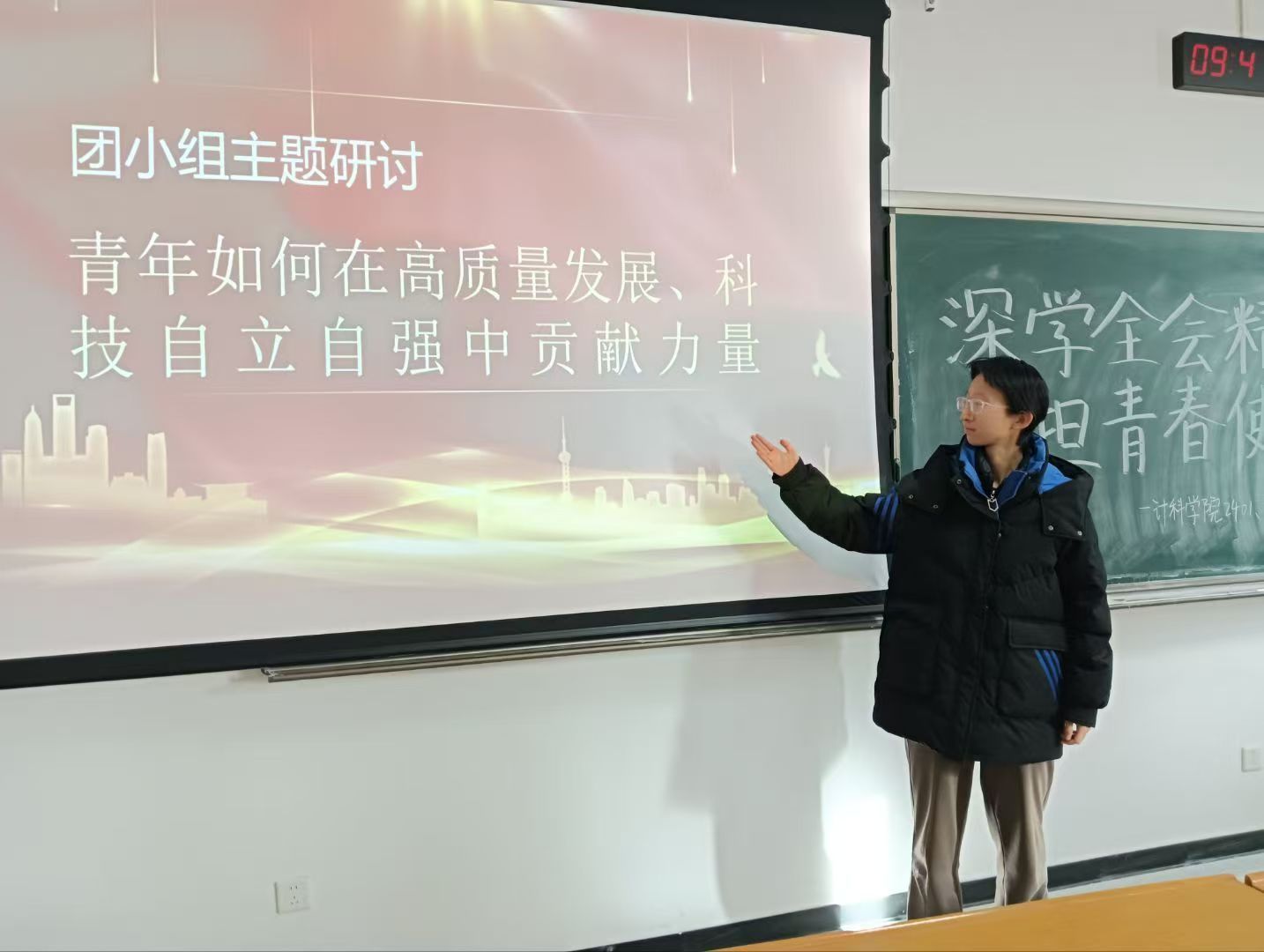 活动中,各团支部采用视频导学、理论深学和交流践悟的学习形式,系统学习党的二十届四中全会的时代背景与重大意义,围绕《中共中央关于制定国民经济和社会发展第十五个五年规划的建议》进行深入学习,引导同学们深刻理解国家未来发展的宏伟蓝图,明确青年一代肩负的时代重任。在互动交流环节,同学们聚焦“青年如何在高质量发展与科技自立自强领域贡献力量”核心议题,踊跃发言、深入研讨,一致表示将立足专业所长、锤炼过硬本领,推动知识储备向解决实际问题的能力转化,以青春动能为高质量发展注入强劲动力。