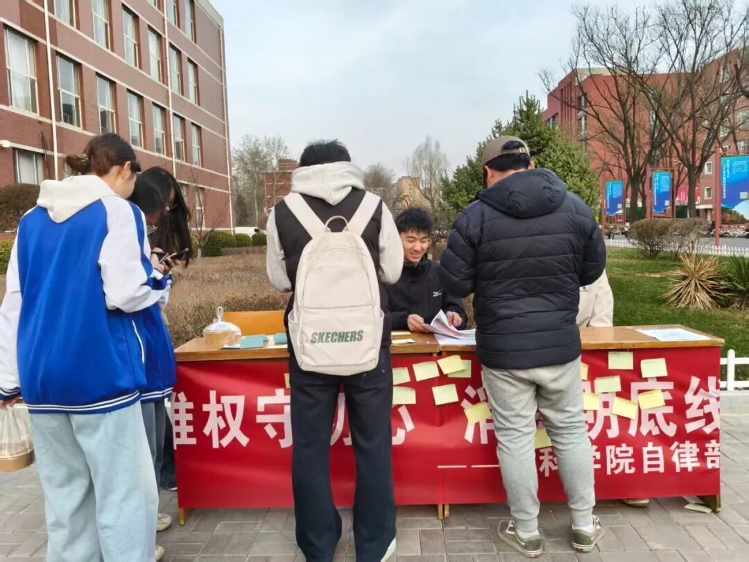 为切实增强同学们的消费维权意识,引导大家树立科学理性的消费观念,我院学生会自律部于3月15日在南区三、四号教学楼中间空地举办了“维权守初心,消费明底线”主题宣传活动,吸引了众多学生驻足参与。